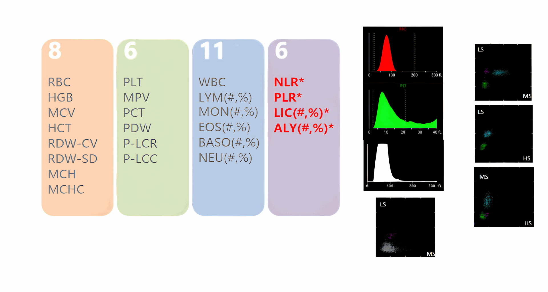 25 Reportable Parameters: WBC - RBC - HGB - HCT - MCV - RDW-CV - RDW-SD - MCH - MCHC - PLT - MPV - PCT - PDW - PLCR - PLCC - LYM% - LYM# - MON% - MON# - NEU% - NEU# - EOS% - EOS# - BAS% - BAS#.